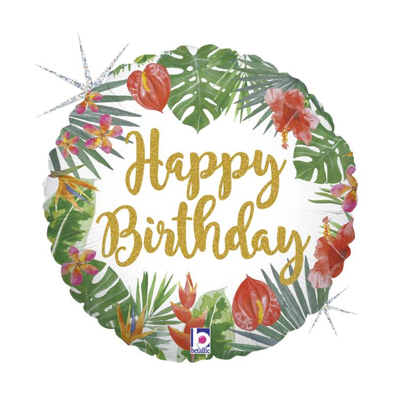 Okrągły balon z napisem Happy Birthday, zdobiony tropikalnymi motywami.