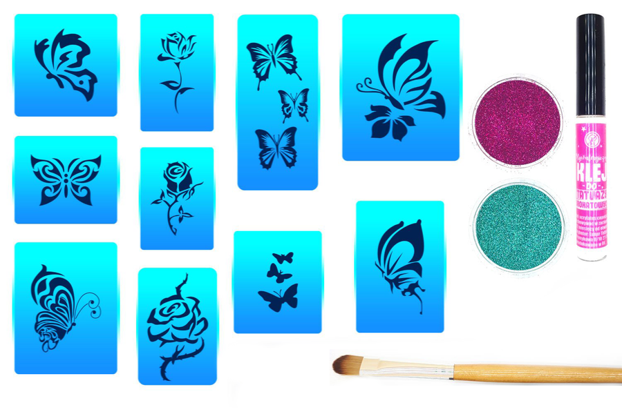 Zestaw szablonów zawierający wszystkie potrzebne produkty do wykonania tatuaży brokatowych.