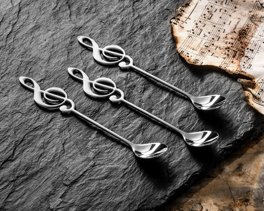 • smukłe metalowe łyżeczki z rączką w kształcie klucza wiolinowego