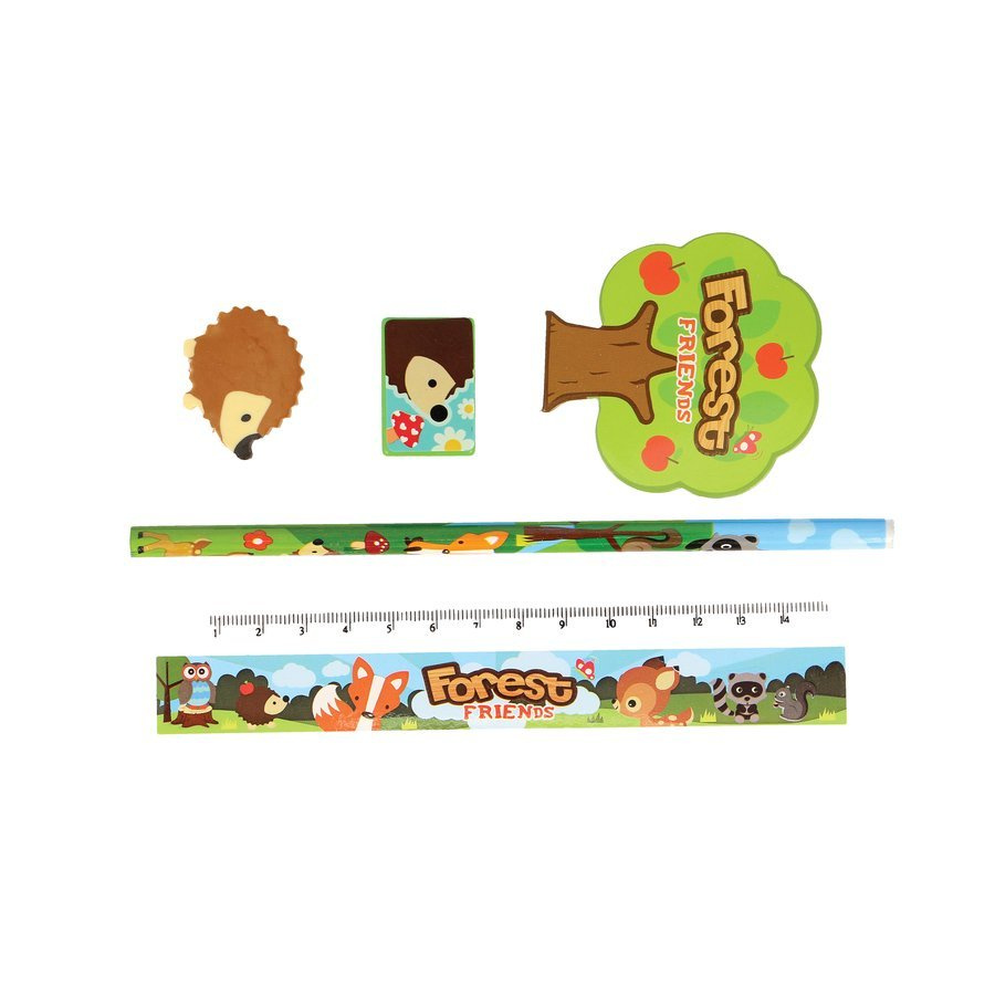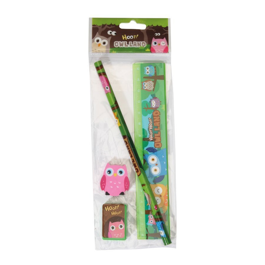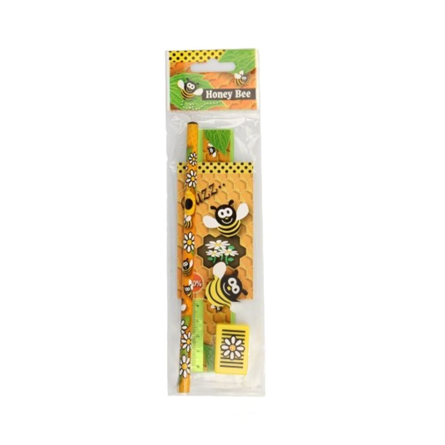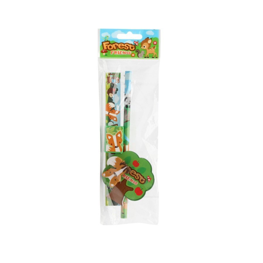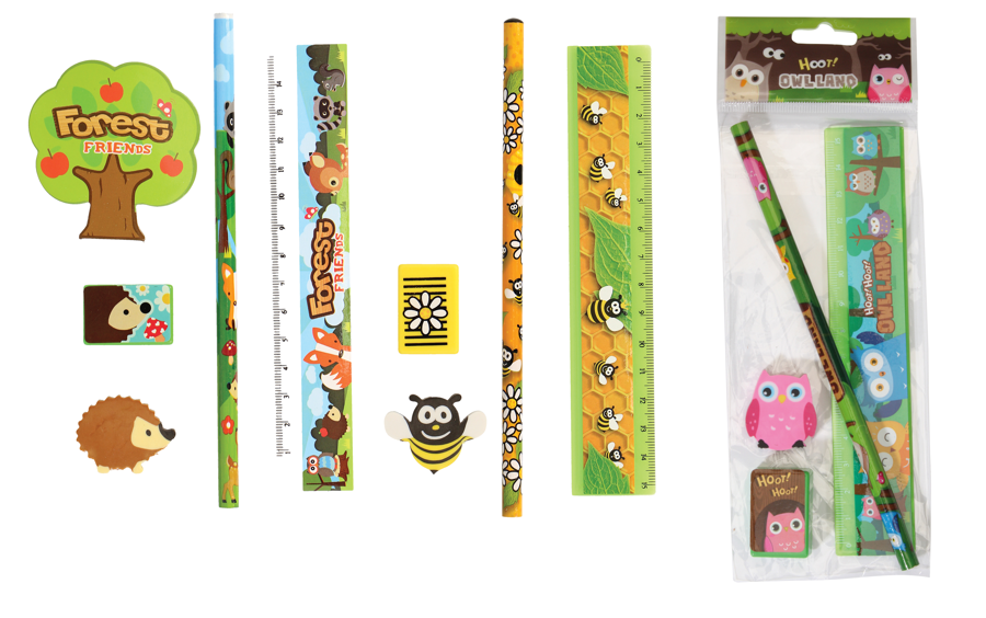 - W zestawie znajduje się: linijka 15 cm, mini notesik, gumka, temperówka i ołówek.
