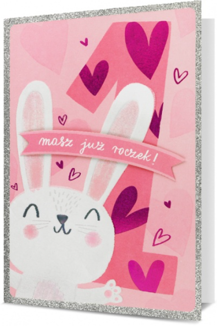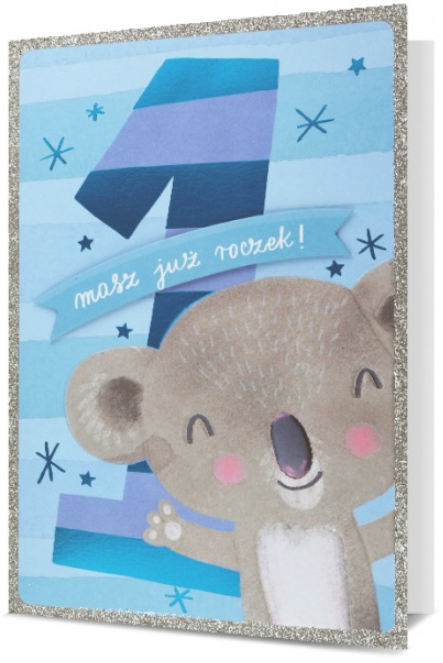 Kartka ze słodkim nadrukiem. Przeznaczona na pierwsze urodzinki maluszka.