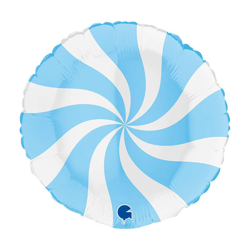 • Okrągły balon matowy ze wzorem "wir" w kolorze biało-błękitnym.