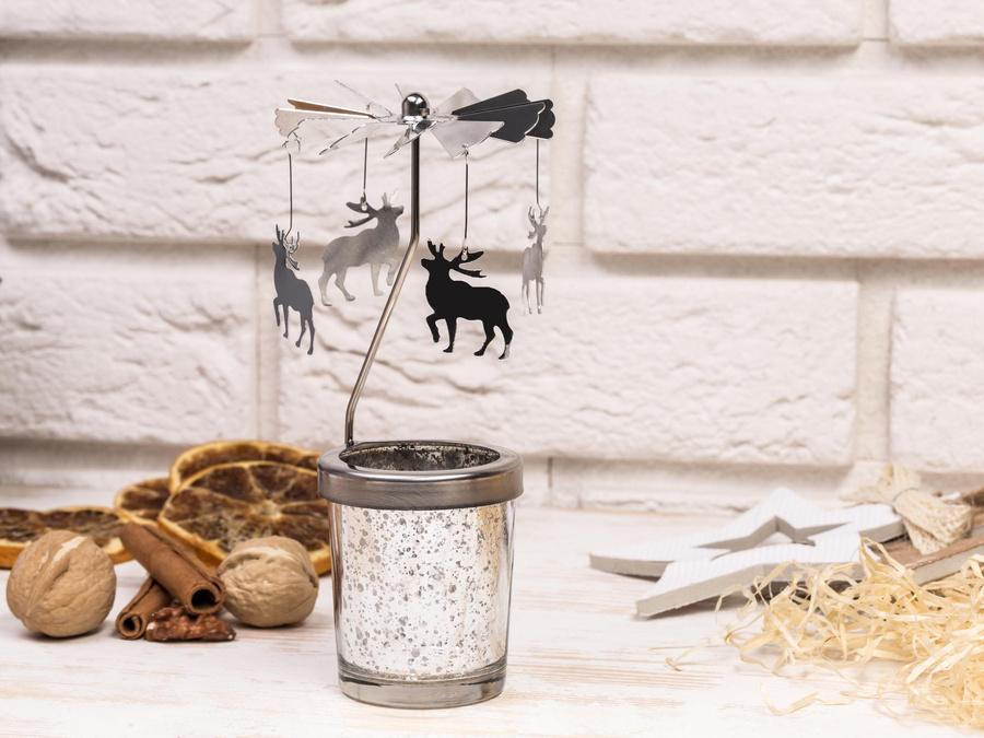 Nostalgiczny świecznik ze szkła i metalu. Ciepło płomienia, że pięknie zaczynają się kręcić jak na karuzeli łosie, sprawiając dużo frajdy nie tylko dzieciom. Niewielka ozdoba, a cieszy.