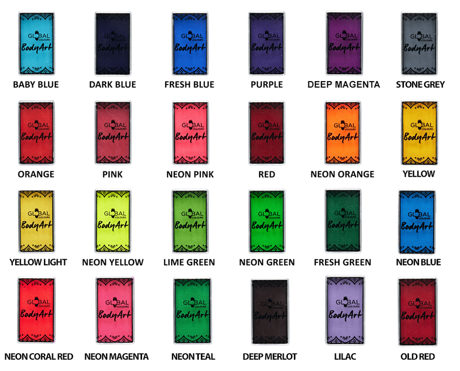 - Dzięki odważnym, żywym kolorom i gładkiej konsystencji farby Global Colours idealnie nadają się do zdobienia twarzy i ciała. Posiadają kremową konsystencję umożliwiającą cieniowanie i precyzyjne mieszanie kolorów. Pojemność 20 gram. Cena za sztukę.