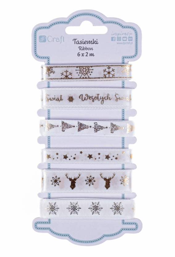 Białe tasiemkli ze złotymi motywami śnieżynek, gwiazdek, reniferów, choinek i napisem "Wesołych Świąt" idealnie wpisują się w panujące trendy.