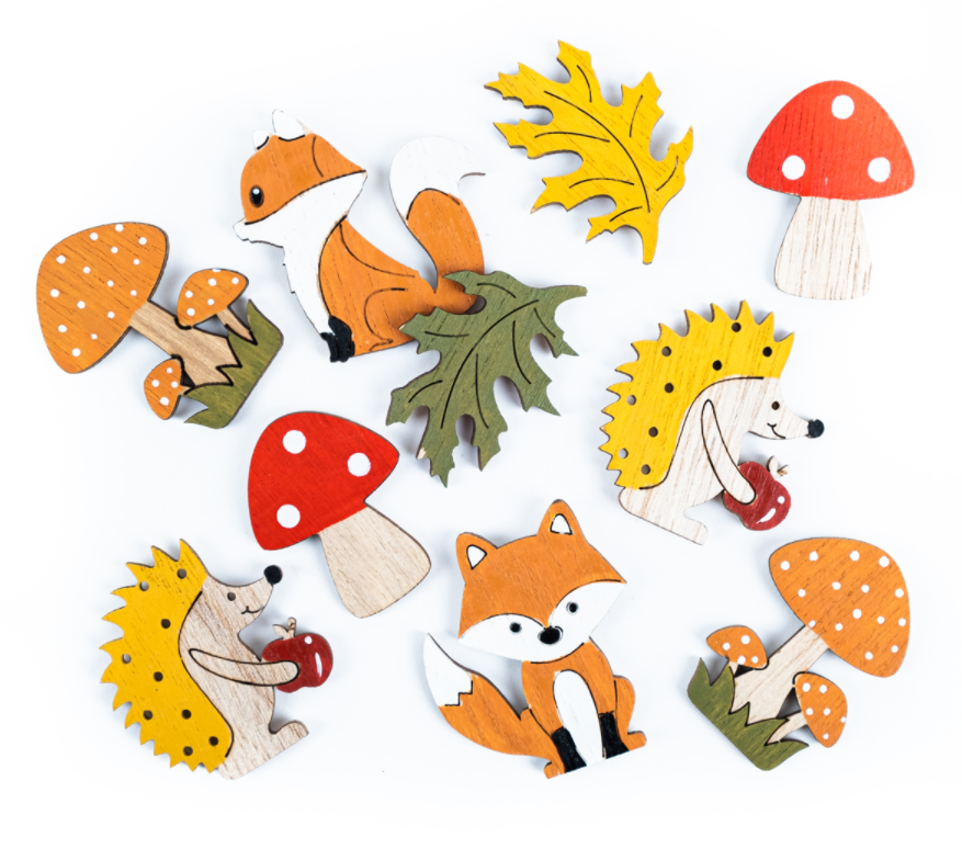 Elementy nie wymagają dodatkowego malowania ani zdobienia. Znajdziesz wśród nich urocze jeżyki, liski, grzybki i liście.