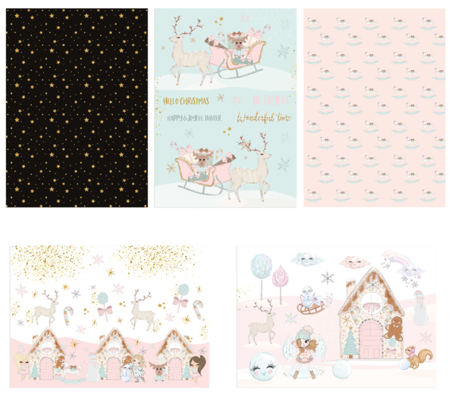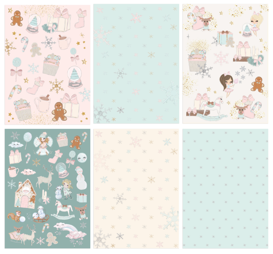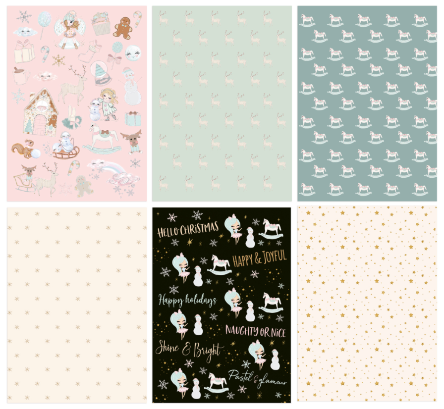 20 wyjątkowych arkuszy w pastelowej, słodkiej tonacji, gdzie pudrowy róż i delikatna mięta przeplatają się z głębią czerni i złotem. Znajdziesz tu typowo świąteczne i zimowe motywy (cukierkowe laski, chatkę z piernika, renifery, śnieżynki,  bałwanki), a także ponadczasowe akcenty (konik na biegunach, gwiazdki).