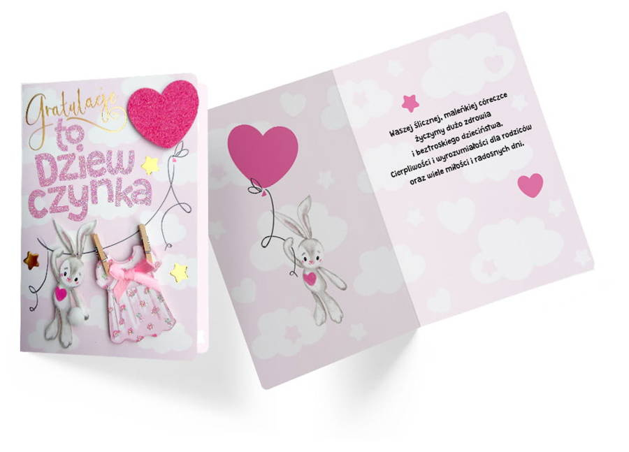 - Kartka z gratulacjami z okazji narodzin córeczki. Wymiary 16.6 x 11.7 cm