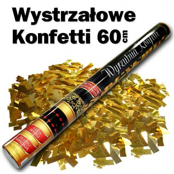 - Wystrzałowe konfetti - tuba 60 cm, wysokość strzału aż 15 metrów. Dostępne kolory: złoty (złote paski) i srebrny (srebrne paski i białe serca).