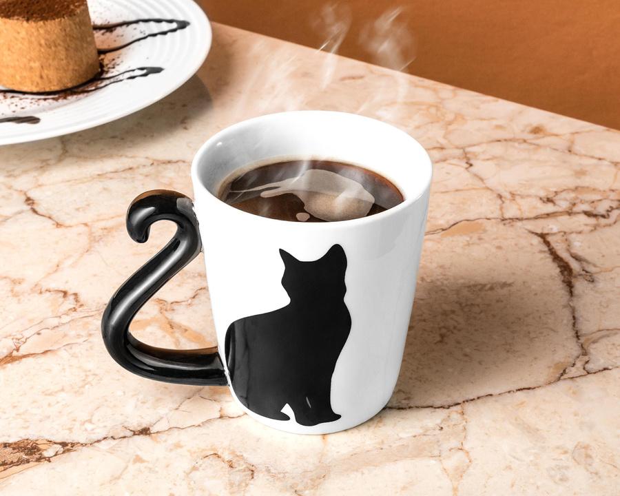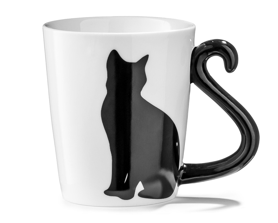 - kubek dla kociarzy z sylwetką kota i uszkiem w kształcie kociego ogona