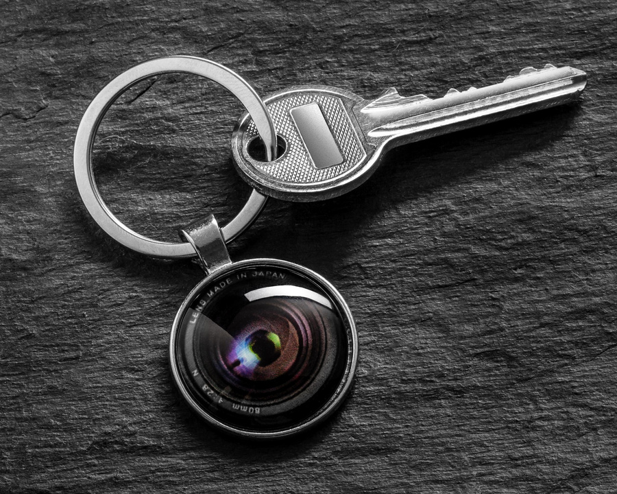 - stylowy brelok wyglądający jak oko obiektywu aparatu