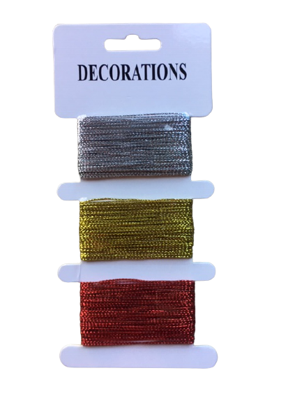 • Elegancki sznurek przeznaczony jest do wiązania, mocowania różnego rodzaju dekoracji i nie tylko. Delikatnie metalizowany, 3 kolory w zestawie: srebrny, złoty, czerwony. Długość każdego sznurka: 10 m.