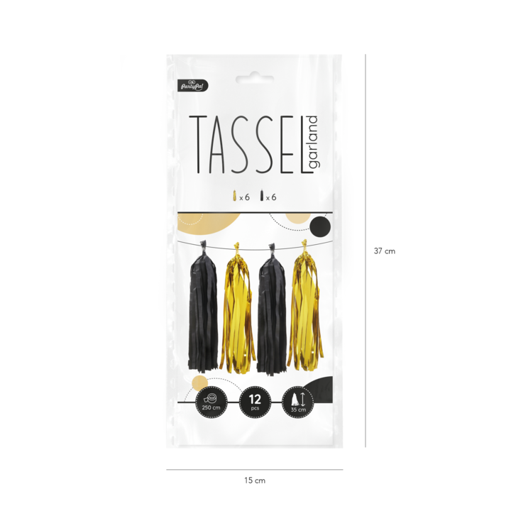 Zestaw zawiera girlandę z 12 frędzlami (6 czarnych i 6 złotych)