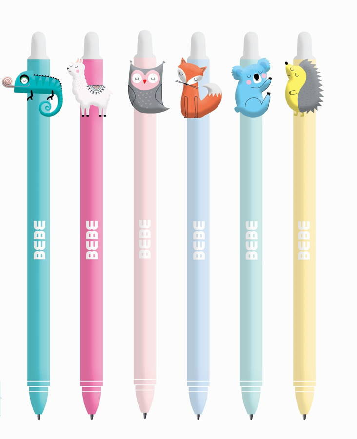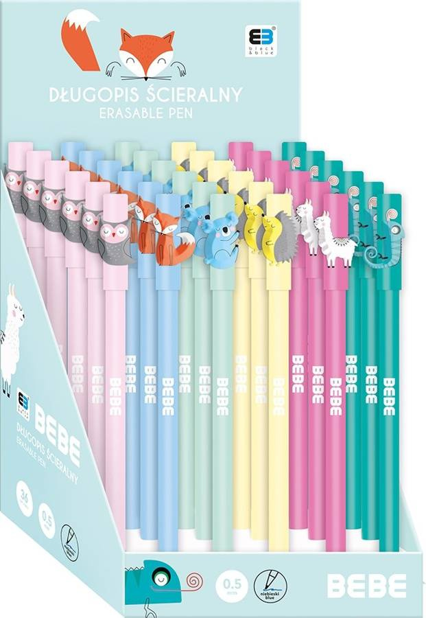 - Wymazywanie poprzez pocieranie gumką umieszczoną na końcu korpusu. Dostępny w kliku wzorach ze zwierzątkami.