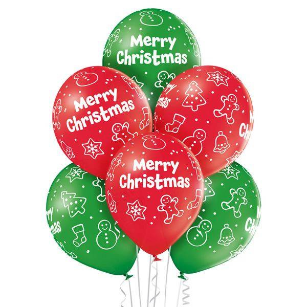 - Balony gumowe o klasycznym kształcie ze Świątecznym nadrukiem. Wielkość 12 cali.