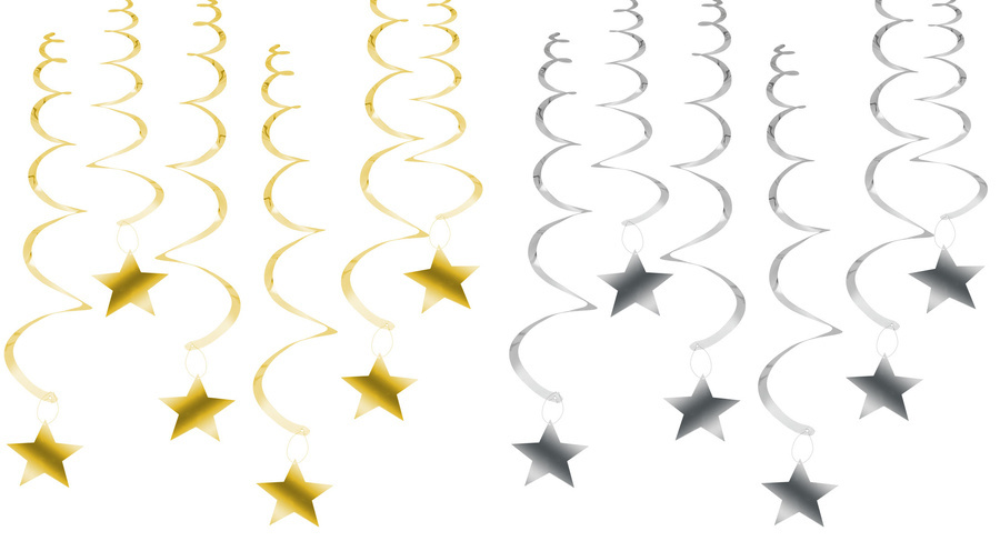 - Dekoracja wykonana z folii. Świderki dostępne w kolorach: złotym oraz srebrnym. Długość: ok. 80 cm. W komplecie: 6 szt.