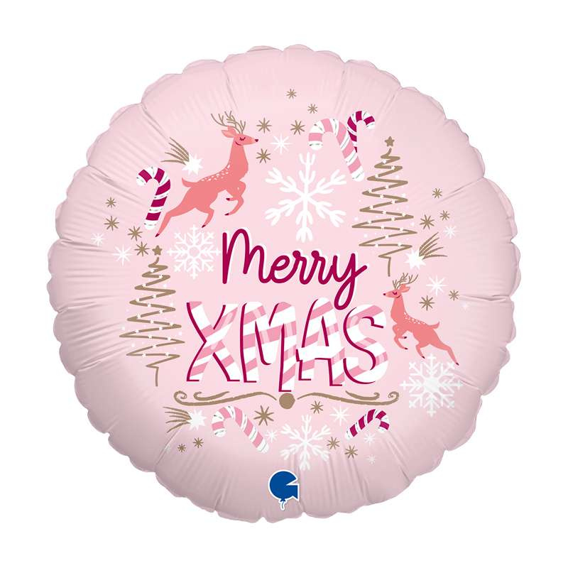 Okrągły balon z napisem Merry Xmas i delikatnym zimowym motywem.
