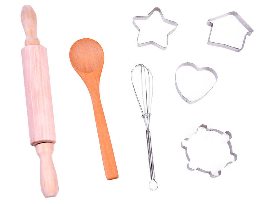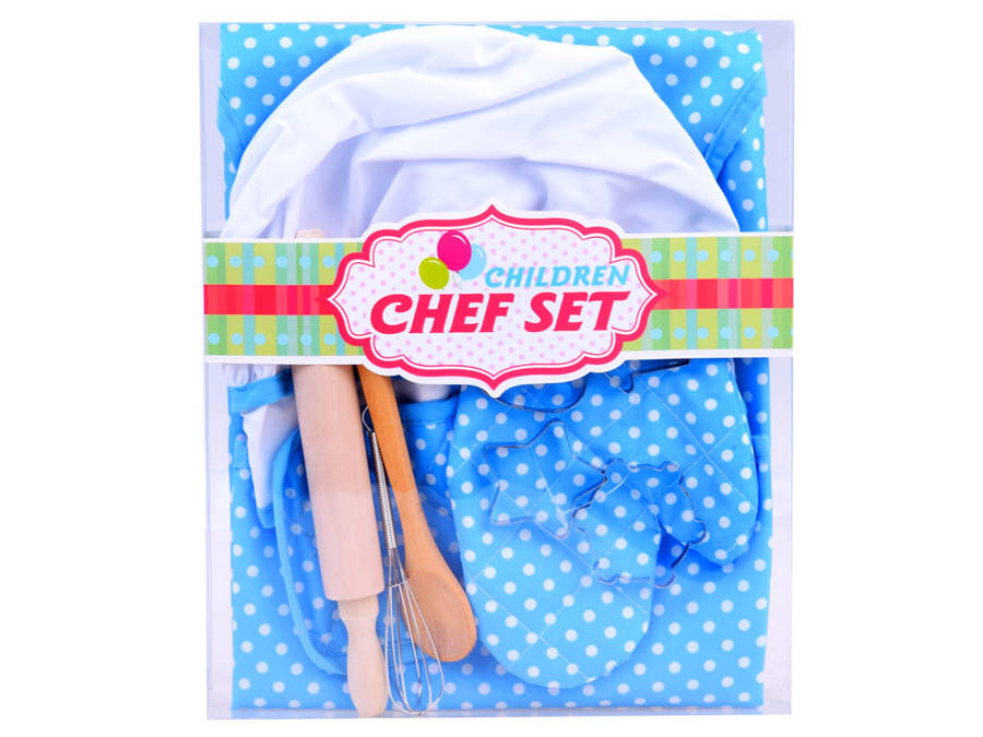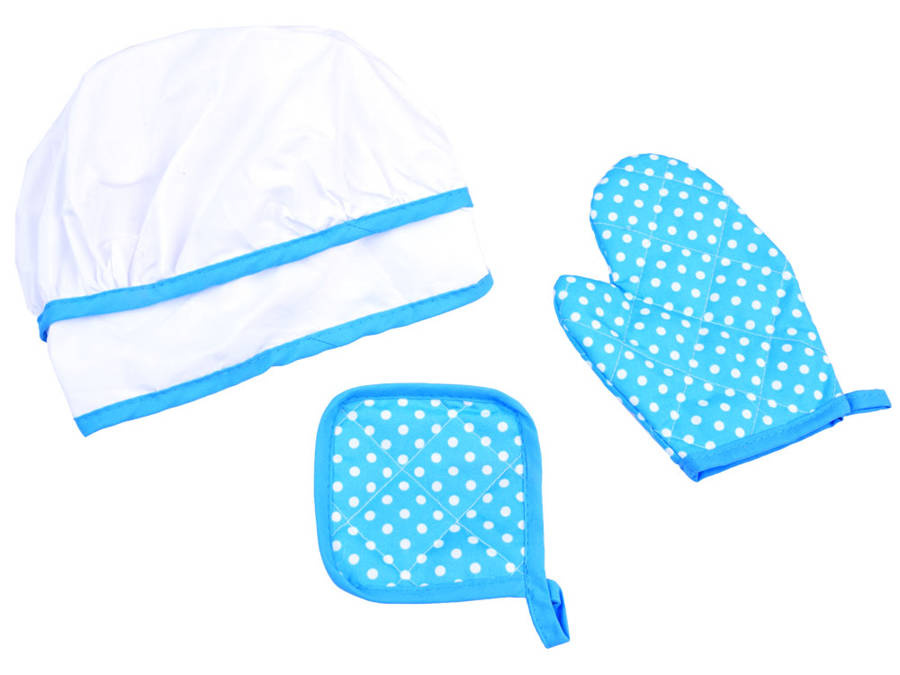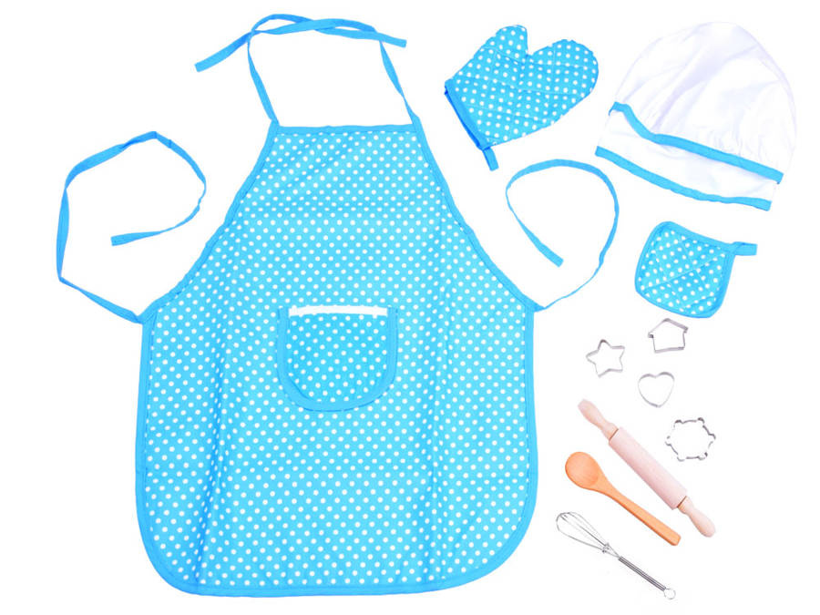 • Zestaw składa się z fartuszka, czapki kucharskiej, rękawicy oraz akcesoriów kuchennych (wałek, łyżka, foremki na ciastka, trzepaczki).