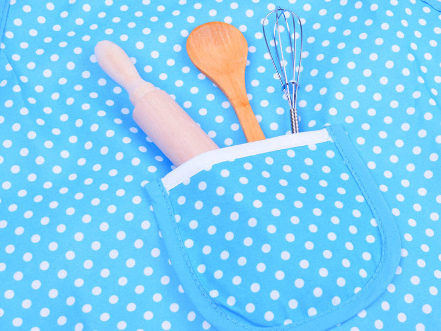 Zestaw składa się z fartuszka, czapki kucharskiej, rękawicy oraz akcesoriów kuchennych (wałek, łyżka, foremki na ciastka, trzepaczki).