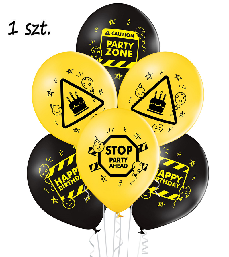 Balony gumowe o klasycznym kształcie ze napisami Party Zone, Party Ahead, Happy Birthday.