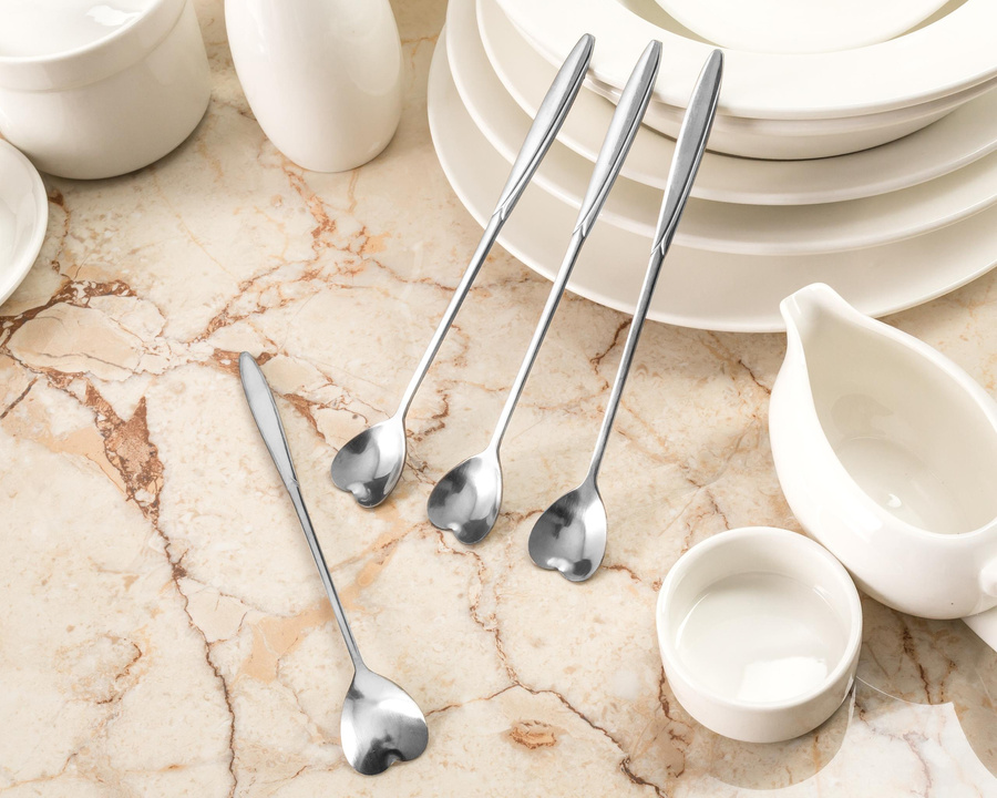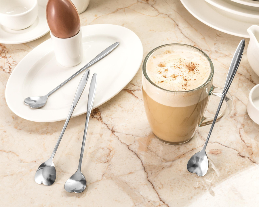 Romantyczny i praktyczny zestaw 4 łyżeczek w kształcie serduszek z długą rączką. Idealny zestaw na słodkie co nieco we dwoje lub nawet w czwórkę ;) Łyżeczki idealnie sprawdzą się przy różnego rodzaju deserach,  ciastach, kawach w wysokich szklankach, a nawet drinkach :)