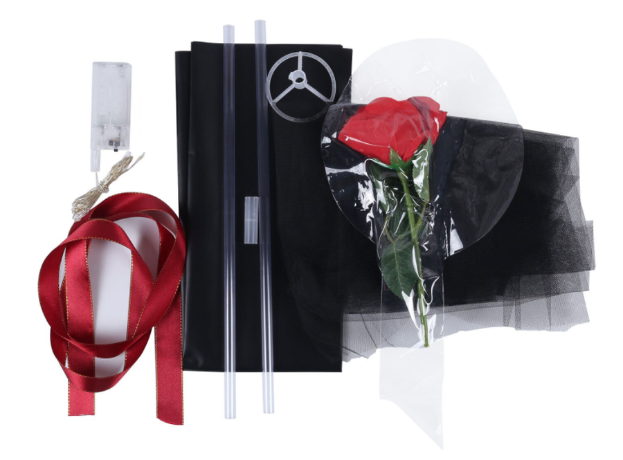 - Zestaw składa się z balonu, lampek, róży, tiulu, papieru ozdobnego oraz wstążki. Cena za zestaw.