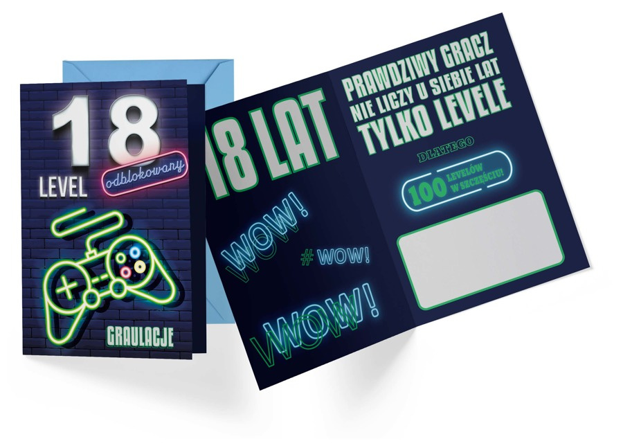 Kartka okolicznościowa na 18 urodziny, idealna dla każdego fana gier video.