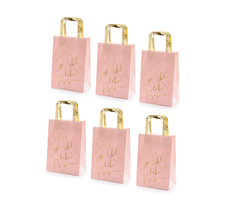 Wyjątkowe i eleganckie torebki na prezenty, różowe ze złotym metalizowanym nadrukiem "Shake like Prosecco" oraz ze złotymi uchwytami.