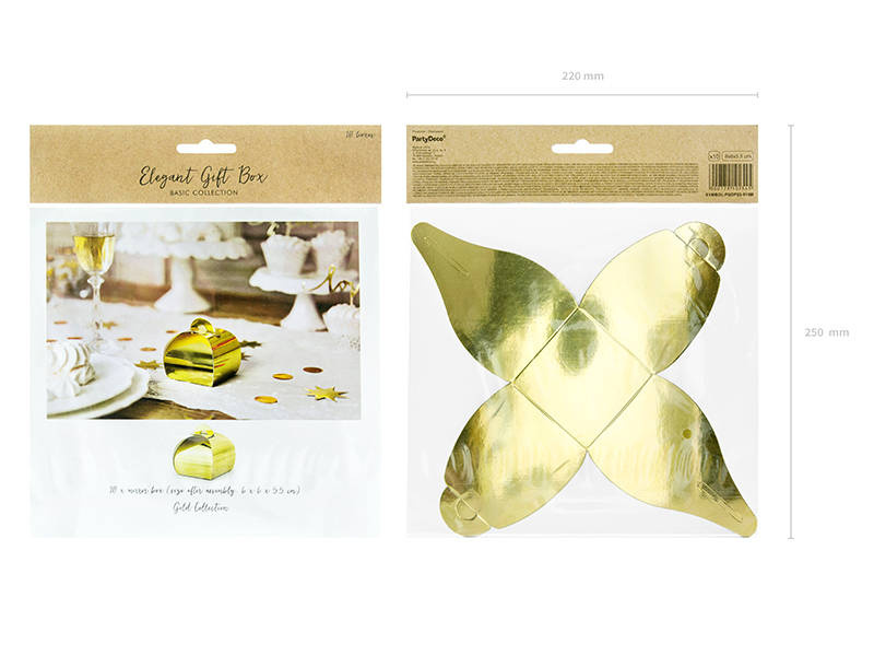 - Pudełeczka wykonane z lustrzanego papieru w kolorze złotym. Wymiary po złożeniu 6 x 6 x 5,5 cm. 10 sztuk w opakowaniu.