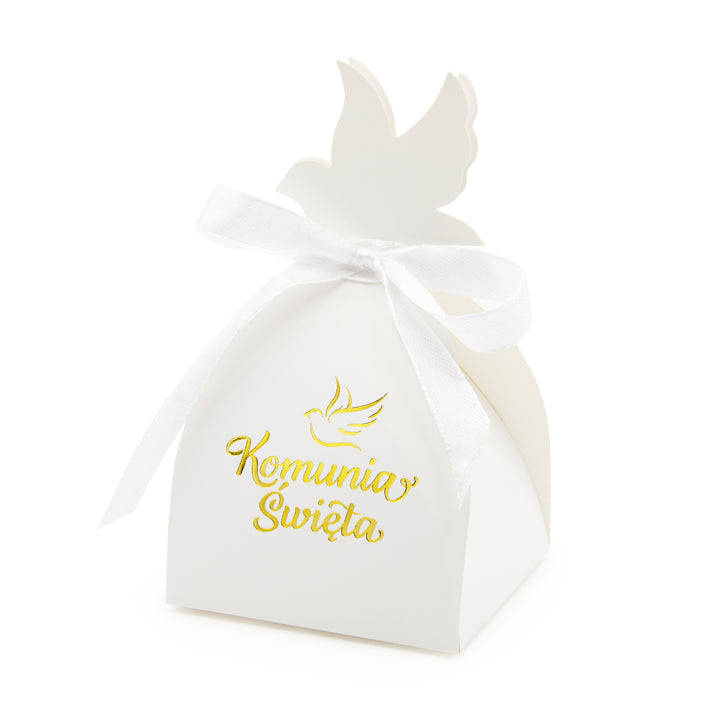 • Pudełeczka przeznaczone są na prezenty, w podziękowaniu dla gości. Zdobione złotym nadrukiem z napisem "Komunia Święta". Do samodzielnego złożenia (DIY). Cena za 6 sztuk.
