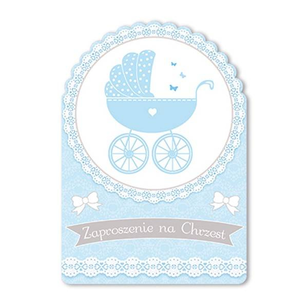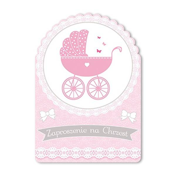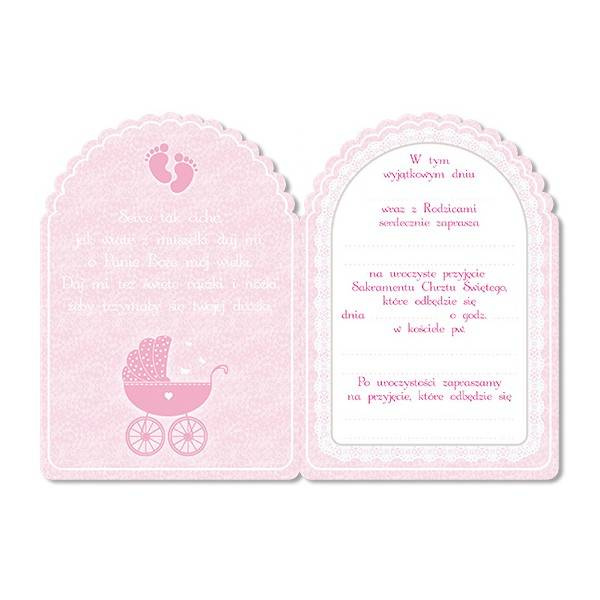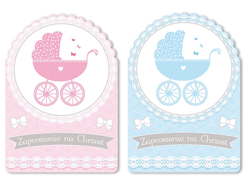 - Zaproszenia na uroczystość Chrztu Świętego. Dostępne w dwóch wersjach kolorystycznych: różowej i niebieskiej. Ciekawy kształt i niepowtarzalny nadruk z wózeczkiem dziecięcym. Wymiary: 10,3 x 14,5 cm. Cena za 10 sztuk.