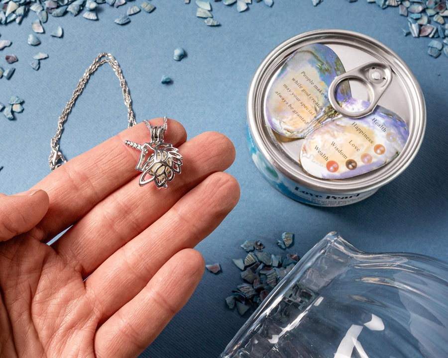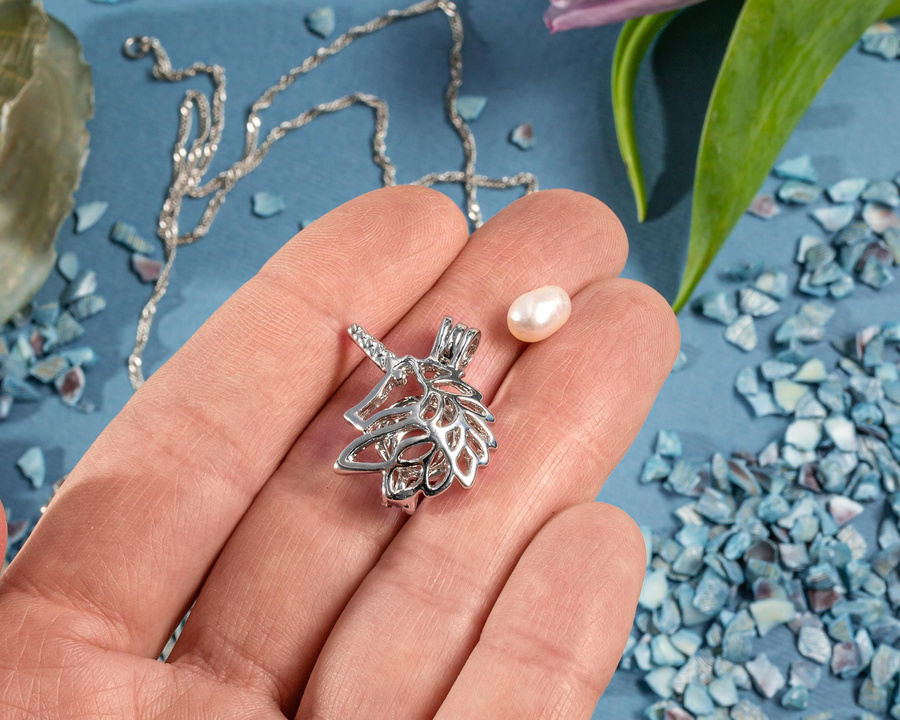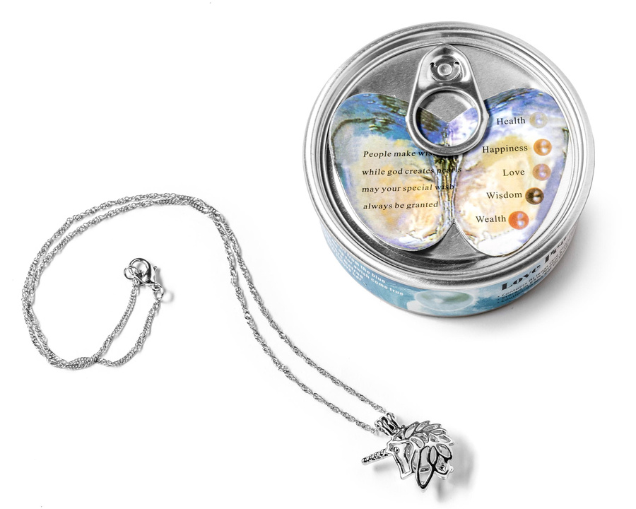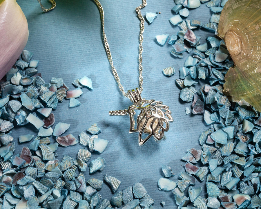 Piękny naszyjnik jednorożec z dwoma perłami. Legendy mówią, że pierwsze perły to łzy aniołów... a w naszym zestawie znajdziesz prawdziwą, naturalną i niepowtarzalną perła do samodzielnego wydobycia z muszli oraz imitację perły świecącą w ciemnościach. Perły możesz zamknąć (pojedynczo) w stylowym koszyczku w kształcie głowy jednorożca, a następnie zawiesić na szyi, by ją pięknie zdobił. Iście baśniowy zestaw.