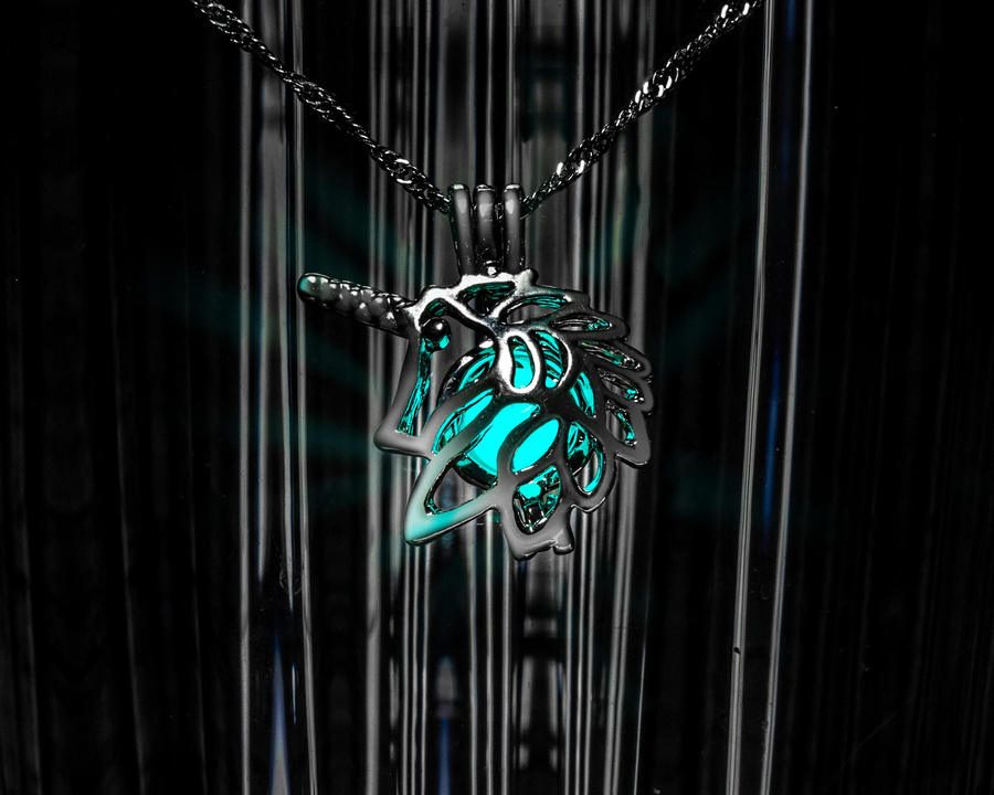 - w zestawie pojemnik z małżą perłową, naszyjnik z wisiorkiem w kształcie głowy jednorożca z imitacją perły świecącą w ciemności