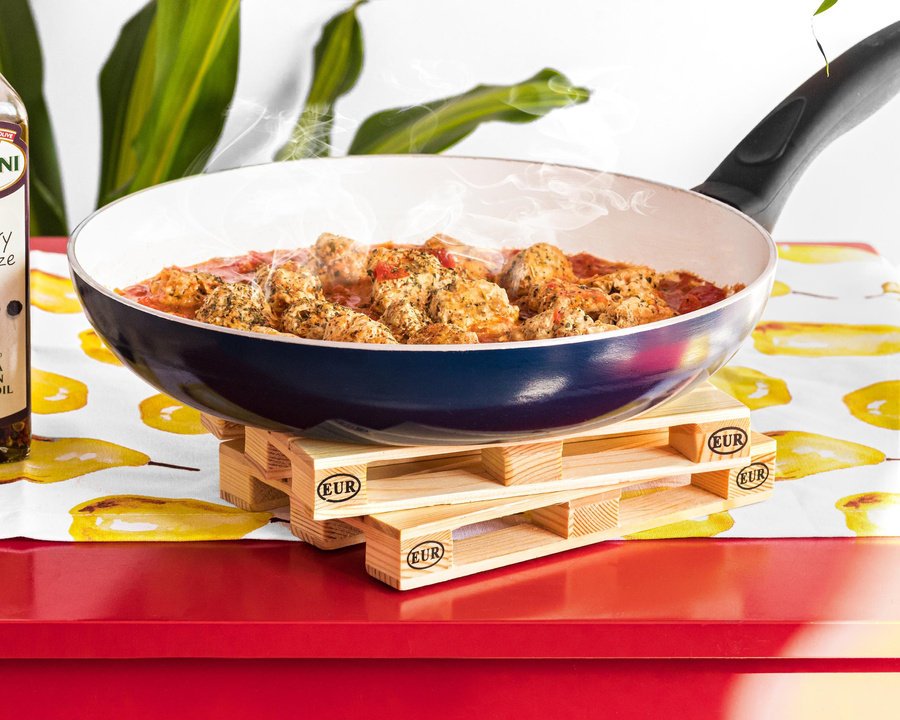 • Stylowe podstawki palety posłużą w kuchni czy na stole pod garnek, patelnię czy inne gorące naczynie jako ochrona blatu ciesząc przy okazji oko domowników i gości. Do złudzenia przypominają bowiem te oryginalne kultowe już wręcz palety transportowe.