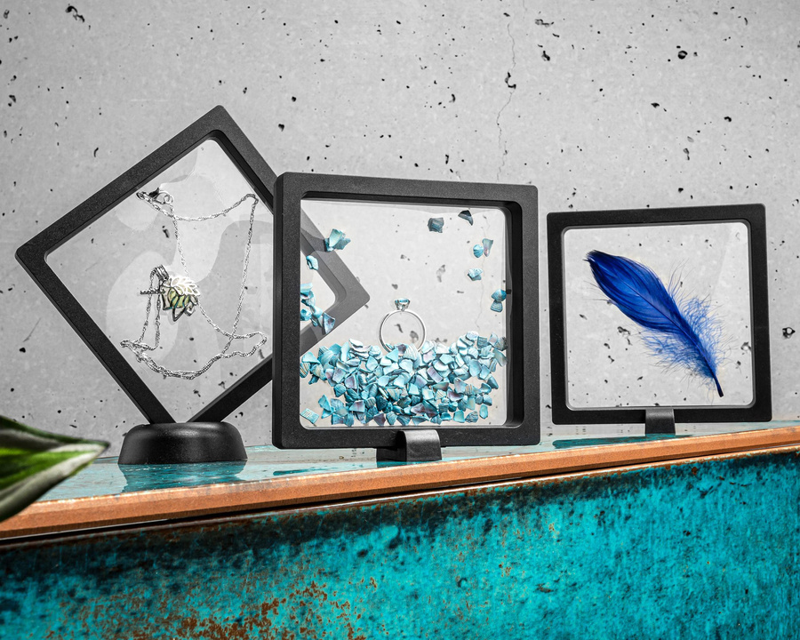 Lewitujące ramki wspomnień to bardzo oryginalny pomysł na nowoczesne i efektowne wyeksponowanie przedmiotów, które przywołują na myśl wyjątkowe chwile. Może to być muszelka z urlopu nad morzem, bilety z koncertu ukochanego zespołu, pierwsze pociski wystrzelone na strzelnicy, jubileuszowa moneta, przypinka z jakiegoś wydarzenia, ulubiona figurka lego czy żołnierzyk z dzieciństwa, medal z maratonu z życiówką, pierścionek zaręczynowy i wiele wiele innych. Każdy z nas przeżył przecież piękne i niepowtarzalne chwile, do których z przyjemnością wraca. Ramki świetnie sprawdzą się również przy przechowywaniu biżuterii, nie tylko chronią przed kurzem, ale wydobywają ponadto całe jej piękno. Dzięki przeźroczystej, elastycznej i odpornej na rozerwania membranie przedmioty zamknięte w ramce wyglądają z odległości jakby unosiły się w powietrzu, co często u oglądających je osób wywołuje efekt "wow" :)