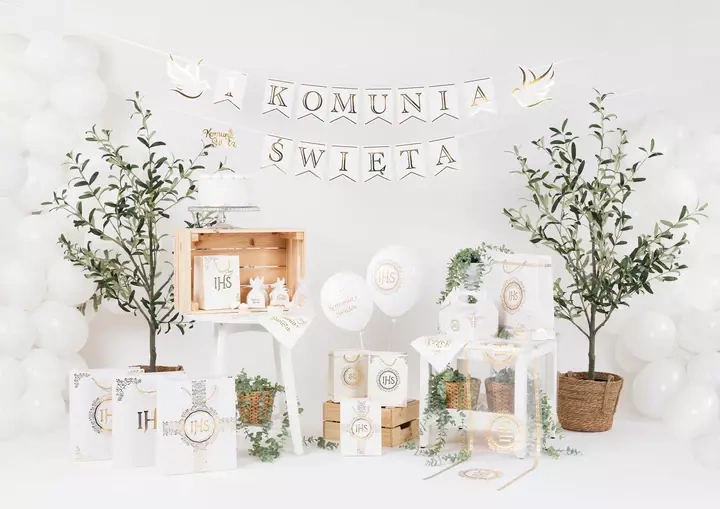 • Super pomysł na dekoracje sali czy kościoła na uroczystość przyjęcia I Komunii, pomoże stworzyć niepowtarzalny klimat. Biały balon ze złotym nadrukiem.