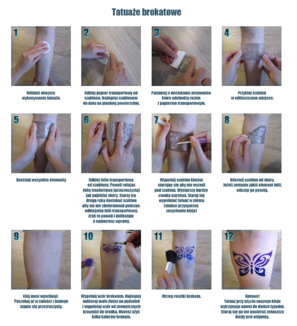 Zestaw szablonów zawierający wszystkie potrzebne produkty do wykonania tatuaży brokatowych.