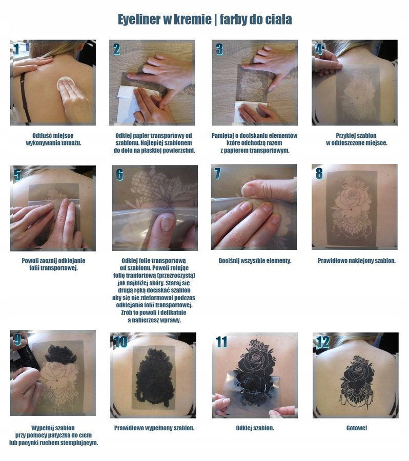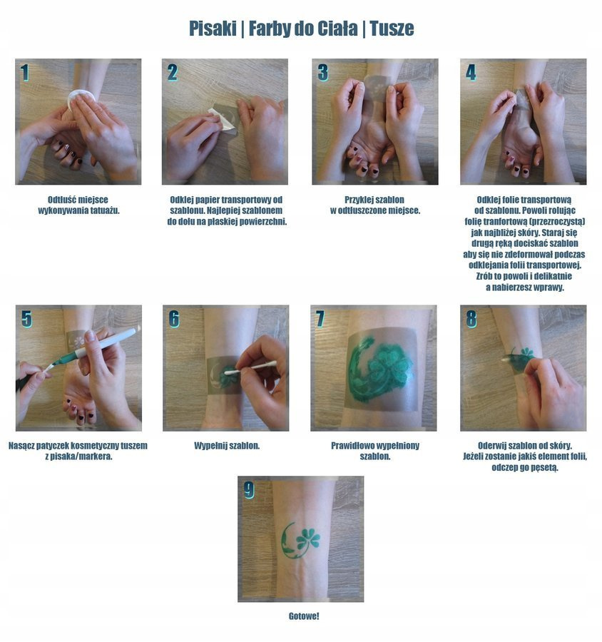 Szablony idealnie nadają się do wykonywania tatuaży brokatowych, tatuaży z henny, tatuaży natryskowych (airbrush) lub tatuaży wypełnianych wszelkimi farbami i pisakami do ciała.