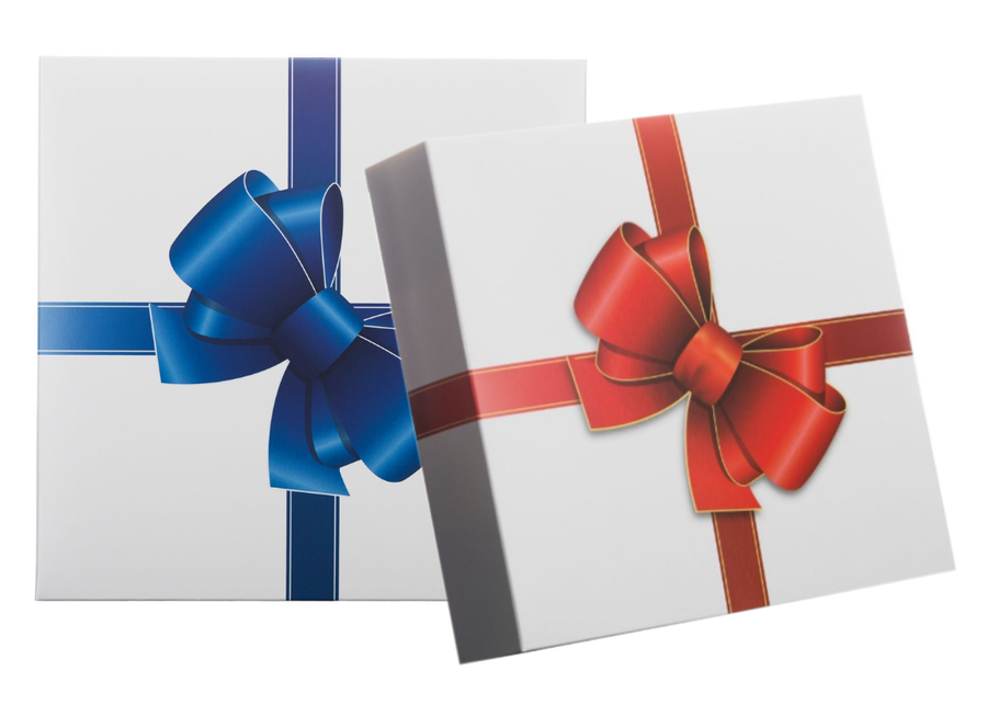 Papierowe pudełko z nadrukowaną kokardą. Do wyboru kolor czerwony lub niebieski.