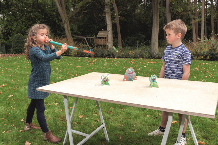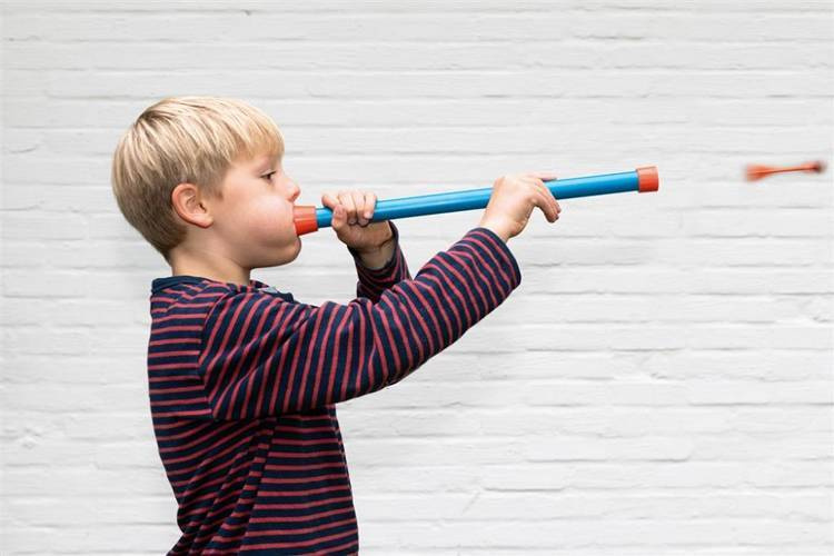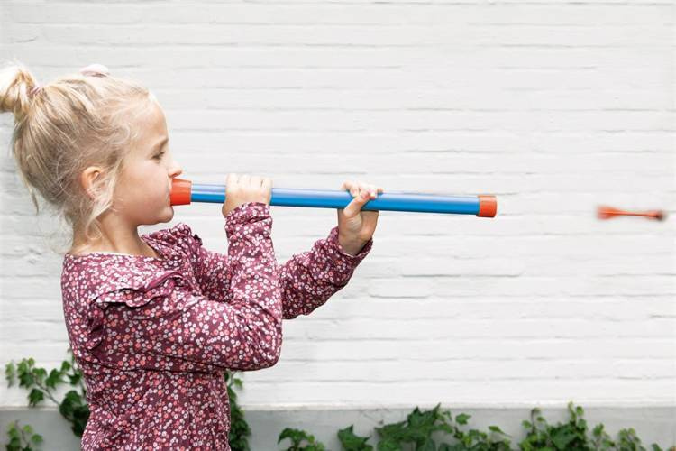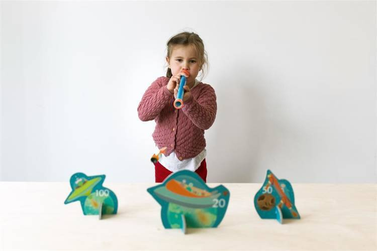 Jak się bawić? Bardzo proste - włóż lotkę w węższy otwór dmuchawki, przyłóż dmuchawkę szerszym otworem do ust, wyceluj, nabierz duuuużo powietrza i dmuuuuchaj. Aerodynamiczne lotki mają zasięg nawet 10 metrów - odległość zależy od siły naszego dmuchnięcia. Można grać na dworze i w pomieszczeniu, ustawiając cele w dowolnym miejscu. Zliczaj punkty i sprawdź kto wygrał. Możesz także oznaczać własne cele np: na szybie, lustrze, drzwiach.