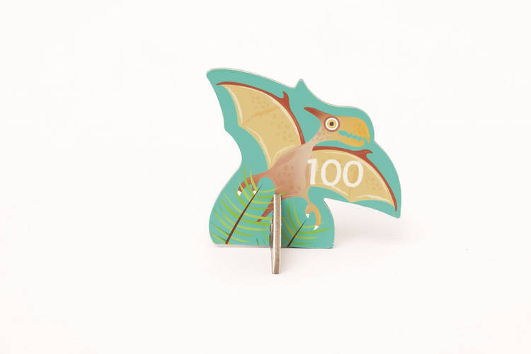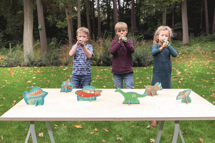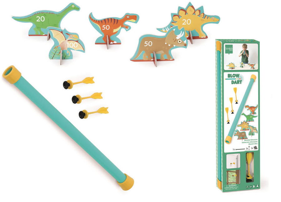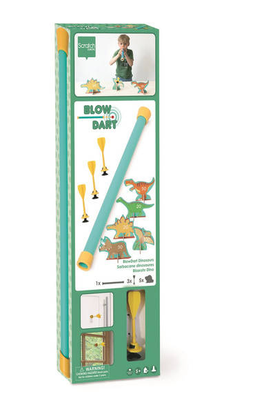 W zestawie: 5 celów (dinozaury), 3 rzutki z przyssawkami, dmuchawka.