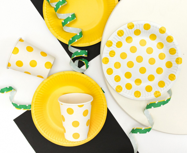 - Jednorazowe talerzyki o średnicy ok. 18 cm. Ilość w opakowaniu: 6 sztuk. Kolor: białe z żółtymi groszkami. Cena za opakowanie.