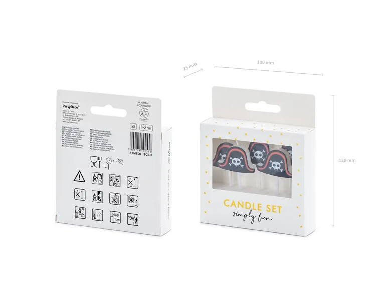 - W zestawie znajduje się 5 świeczek z motywem pirackim, umieszczone są na patyczkach, które należy wbić w tort lub inne przekąski. Wysokość bez patyczka: ok. 2 cm.