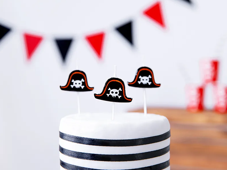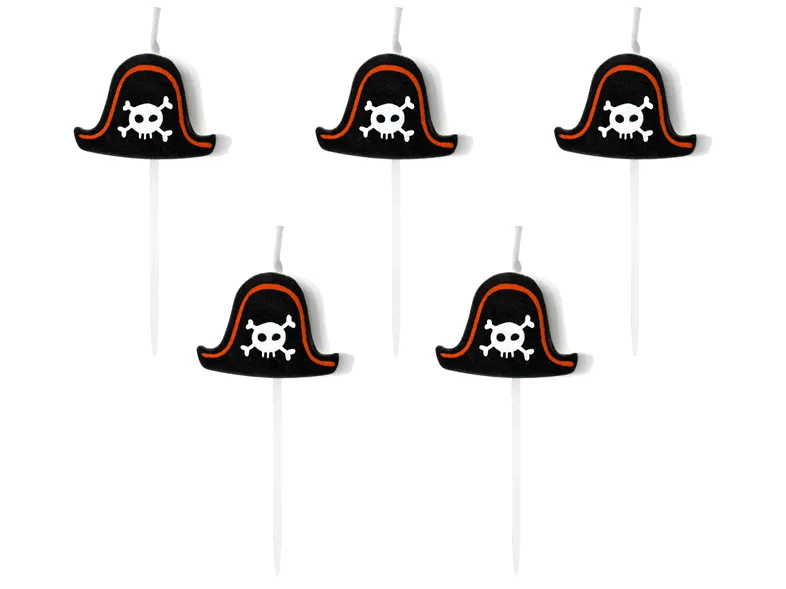 W zestawie znajduje się 5 świeczek z motywem pirackim, umieszczone są na patyczkach, które należy wbić w tort lub inne przekąski.