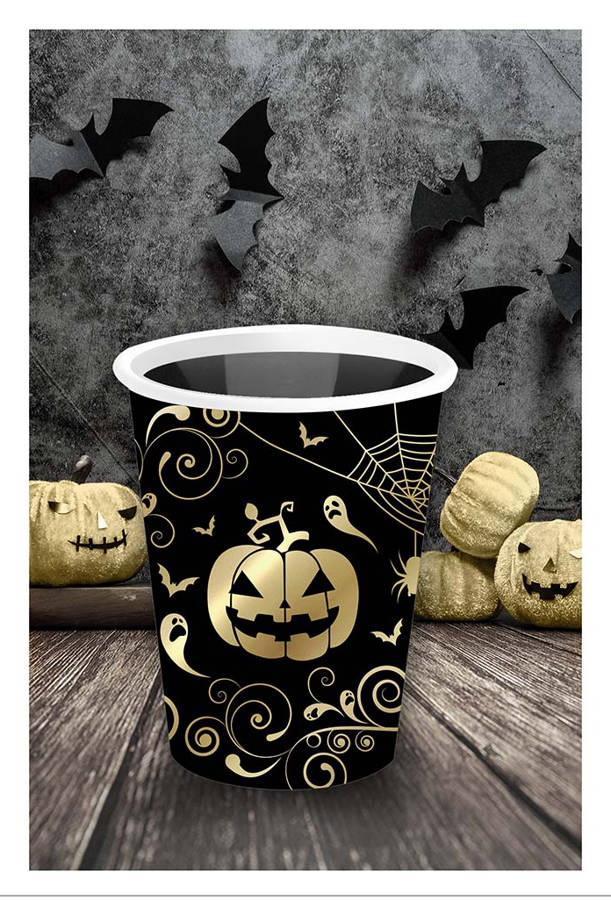 - Kubeczki papierowe z motywem z dynią i pajęczynami, idealne na Halloween, o pojemności 240 ml. Zestaw 6 sztuk.