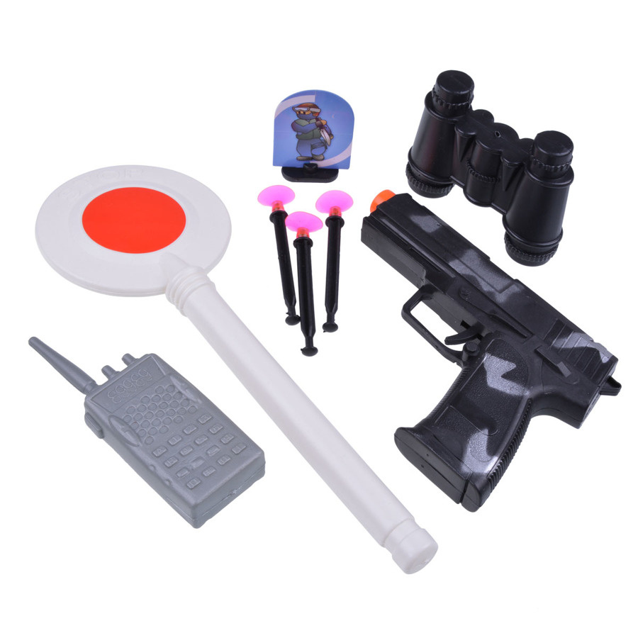 - Zestaw zawiera: lizak, lornetkę, imitację walkie-talkie oraz lotki z przyssawkami, a także mały cel.
