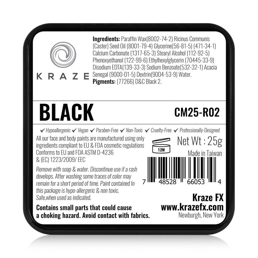 KrazeFX to najwyższej jakości farby do twarzy i ciała. Wyjątkowo napigmentowana formuła na bazie wosku zapewnia gładkie i mocne krycie. Farby są odporne na blaknięcie i pękanie, szybko wysychają. Należy aktywować je odrobiną wody i nakładać za pomocą pędzla lub gąbki.