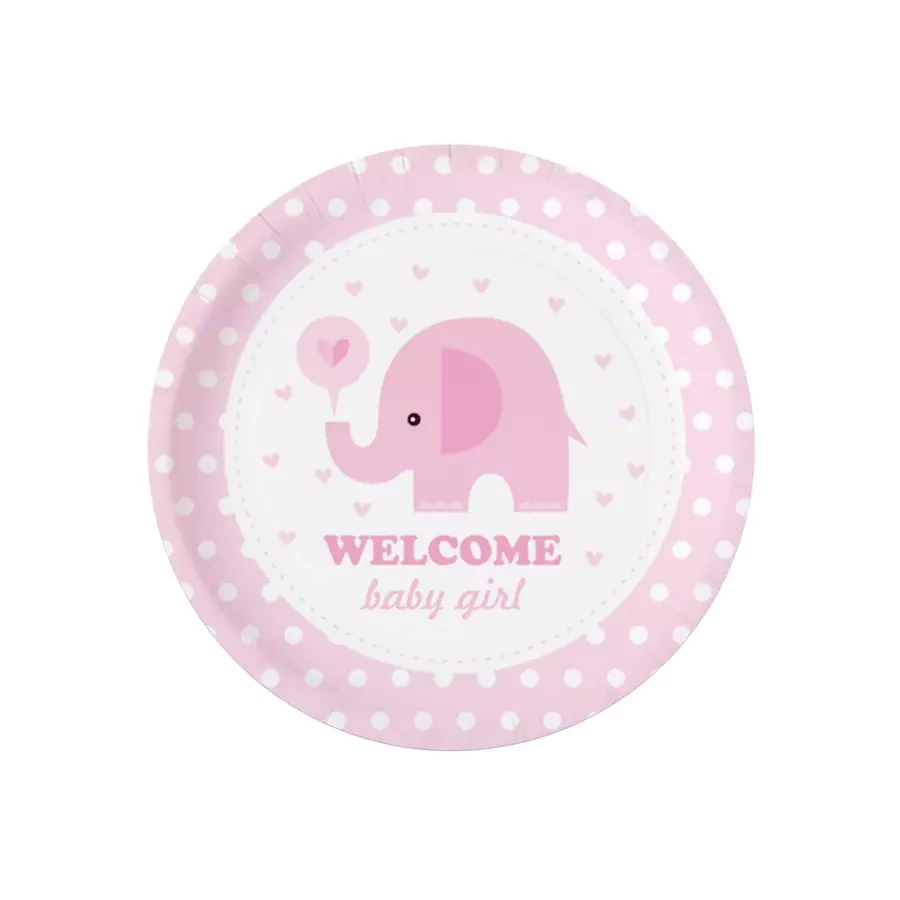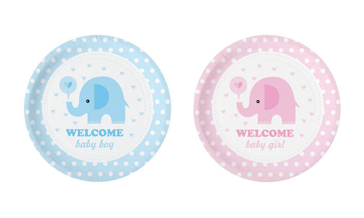 - Talerzyki wykonane z tektury, okrągłe, płytkie. Talerzyki posiadają nadruk ze słonikiem i napisem "Welcome Baby Girl" / "Welcome Baby Boy".
