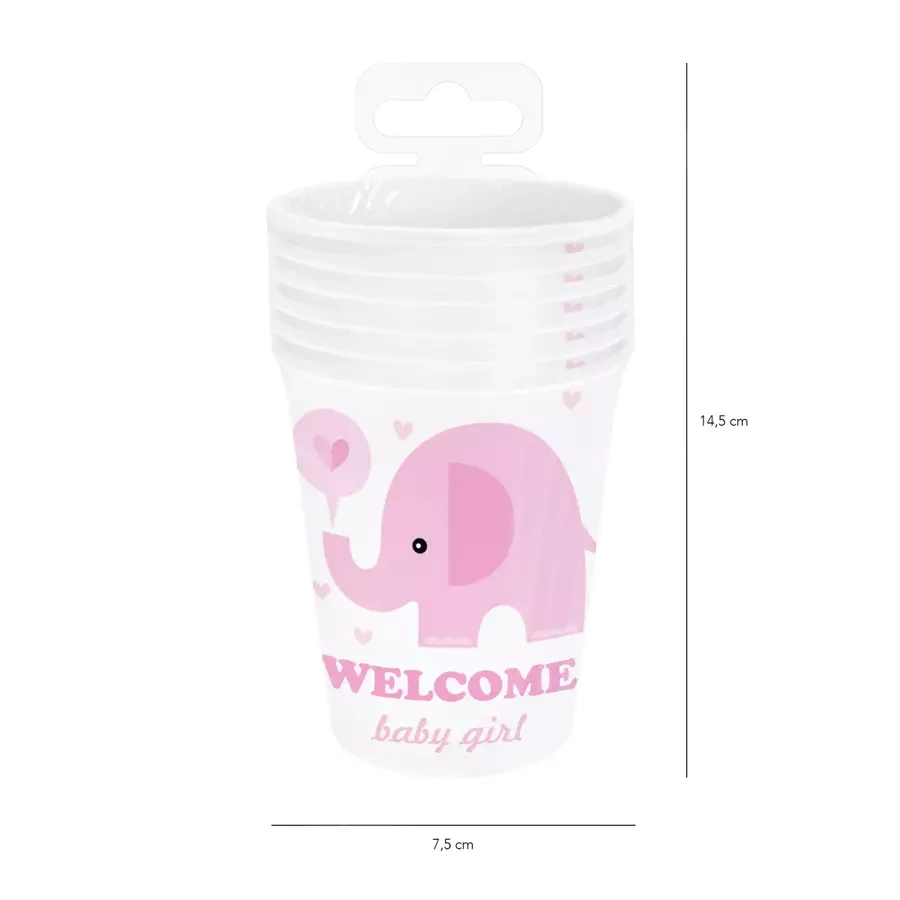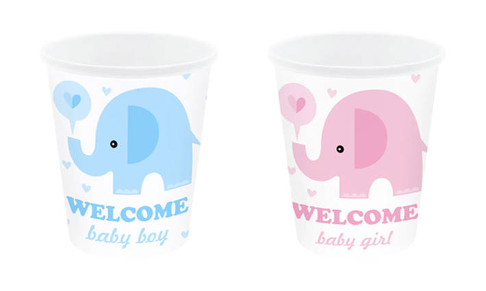 Jednorazowe, papierowe kubeczki z nadrukiem ze słonikiem i napisem "Welcome Baby Girl" / "Welcome Baby Boy"
