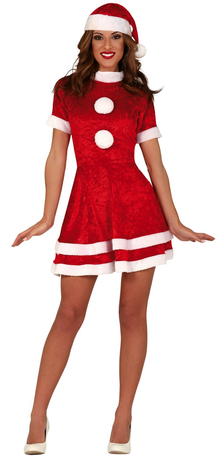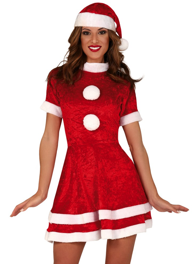 Sukienka wykonana z materiału imitującego welur w kolorze czerwonym. Wykończona białym, pluszowym materiałem. Na środku doczepione dwa pompony.